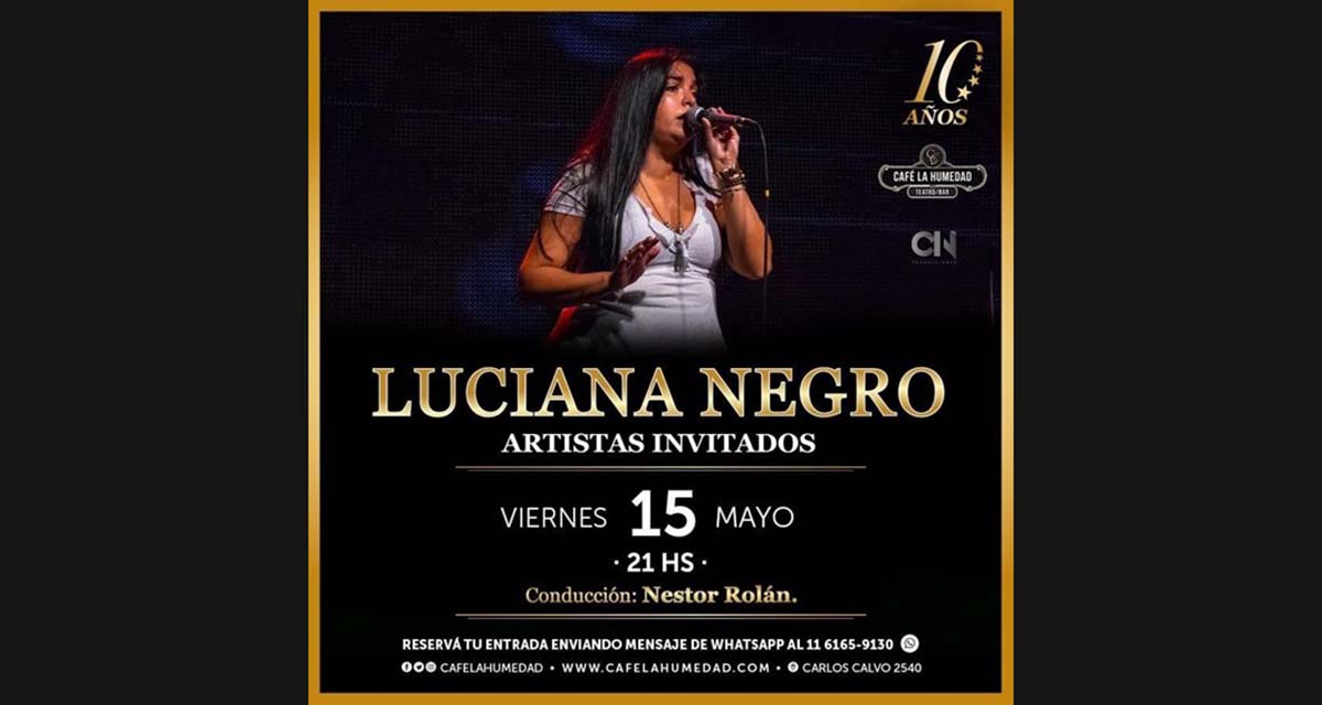 El próximo viernes 15 de mayo a las 21:00 hs, el prestigioso escenario de Café La Humedad abrirá sus puertas para recibir a Luciana Negro. En el marco de las celebraciones por los 10 años del mítico local, la artista ofrecerá un espectáculo cargado de emoción, técnica y ese sentimiento único que la caracteriza.