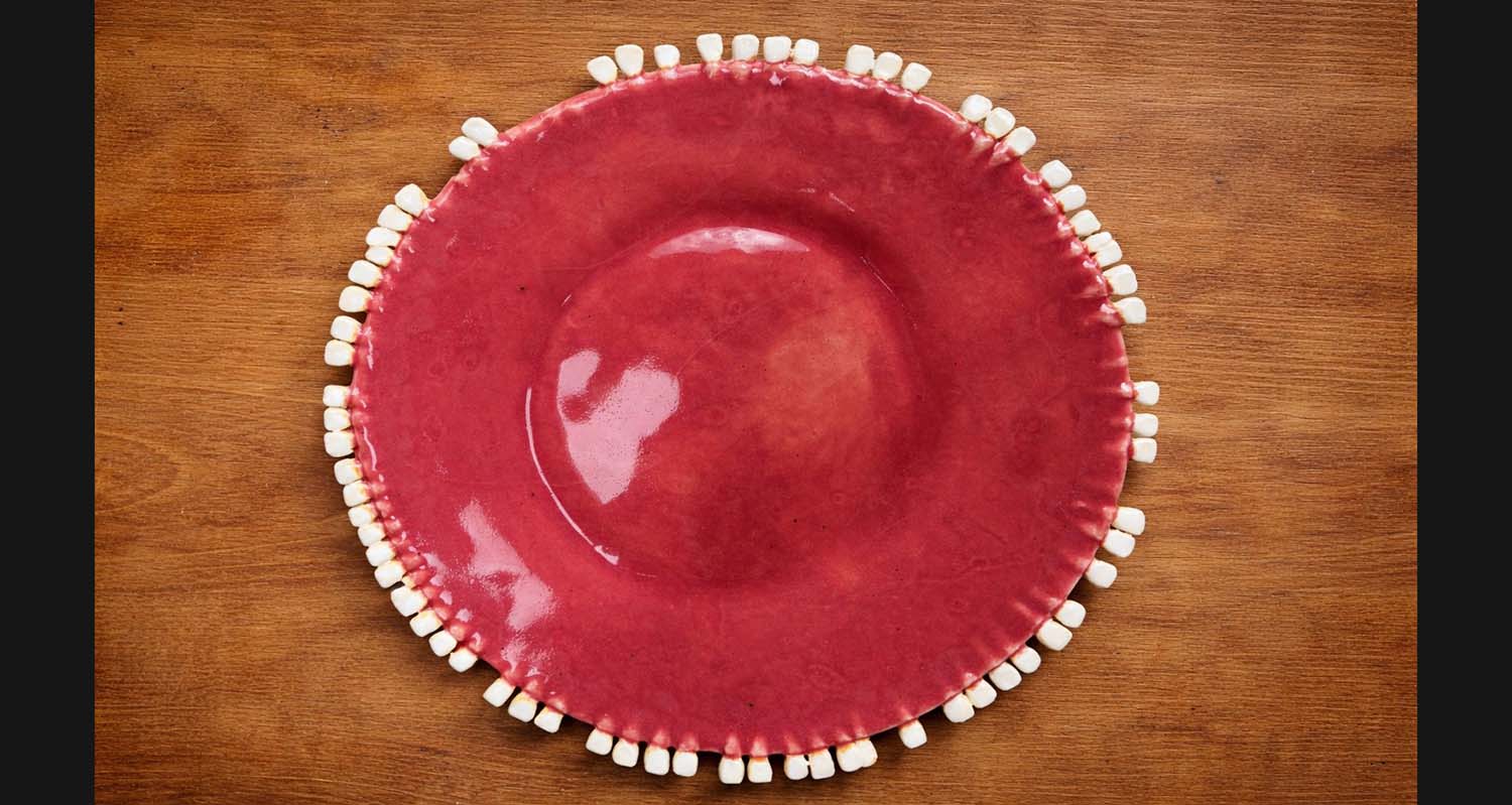 La exposición reúne un conjunto de piezas de cerámica intervenidas —platos, bowls, vasos y fuentes— que incorporan formas orgánicas como dientes, cavidades, papilas y pliegues internos del cuerpo. Sobre objetos asociados al ritual cotidiano de la mesa, la artista introduce una dimensión inquietante que altera su función habitual y desplaza la escena doméstica hacia otro registro.