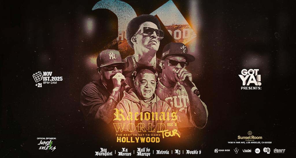 Los legendarios Racionais MC’s llegan a Los Ángeles para ofrecer un show histórico que forma parte de la última gira del grupo antes de su retiro oficial. El evento tendrá lugar el 1 de noviembre de 2025, en el Sunset Room Hollywood, y promete ser un hito cultural que celebrará décadas de impacto, resistencia y autenticidad del grupo más influyente del rap brasileño.