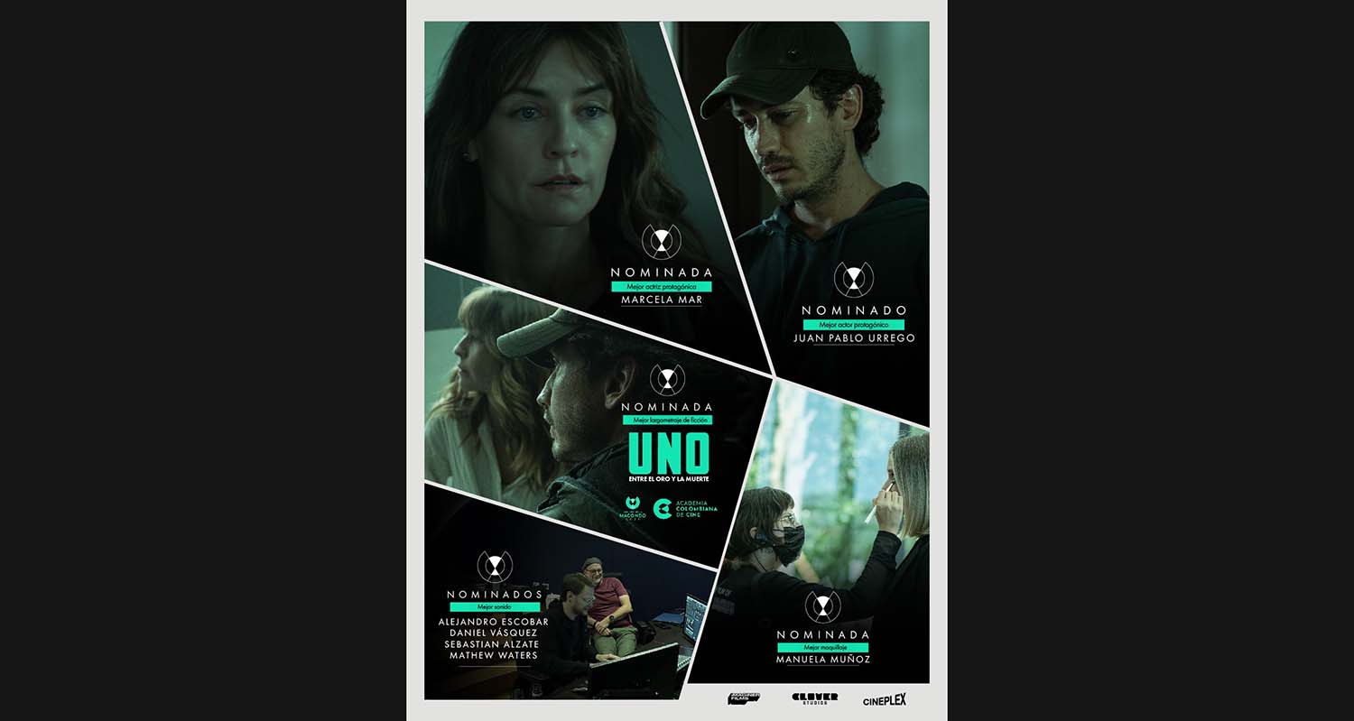 Entre las producciones nominadas se encuentra UNO, entre el oro y la muerte, ópera prima del director Julio César, que competirá en las categorías Mejor Largometraje de Ficción, Mejor Actriz Principal (Marcela Mar), Mejor Actor Principal (Juan Pablo Urrego), Mejor Sonido y Mejor Maquillaje.